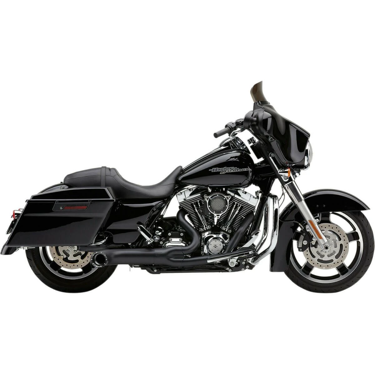 Cobra headpipe merges into a large 2.25-inch collector that steps up to a 2.5-inch core. They perforated the core and wrapped it in a stainless steel screen then enclosed it in a fiberglass pillow to get the performance and sound we wanted. Then covered the collector with a large one-piece heat shield that is held in place with two clamps and stamped the Cobra logo on it as well. A 4-inch muffler body capped with a 4-inch machined aluminum dual-cut tip that features small alluvial flutes. The body can be rotated 10-degrees up or down from its center position allowing the rider to determine the final positions. And it works with either stock or extended bags.
