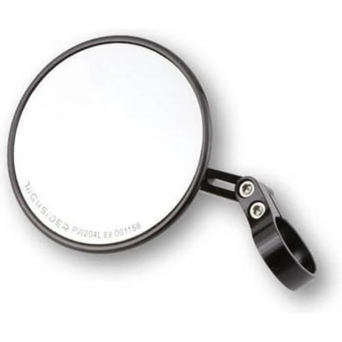 The Highsider Montana 2 Bar End Mirror is built for both left and right sides of handlebars. Complete with a black anodized finish and a round aluminum mirror head, this bar end mirror offers a noble design. The mirror arm has three stylish air vents built into the mirror stem. A hinge on the clamp provides additional adjustment for better visibility. The mirror head can be directed inwards or outwards with an Allen key. Fits 1″ and 7/8″ handlebars. Sold each.