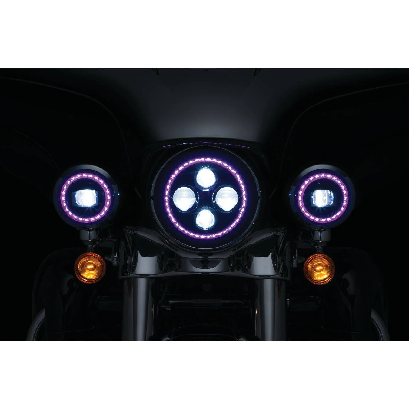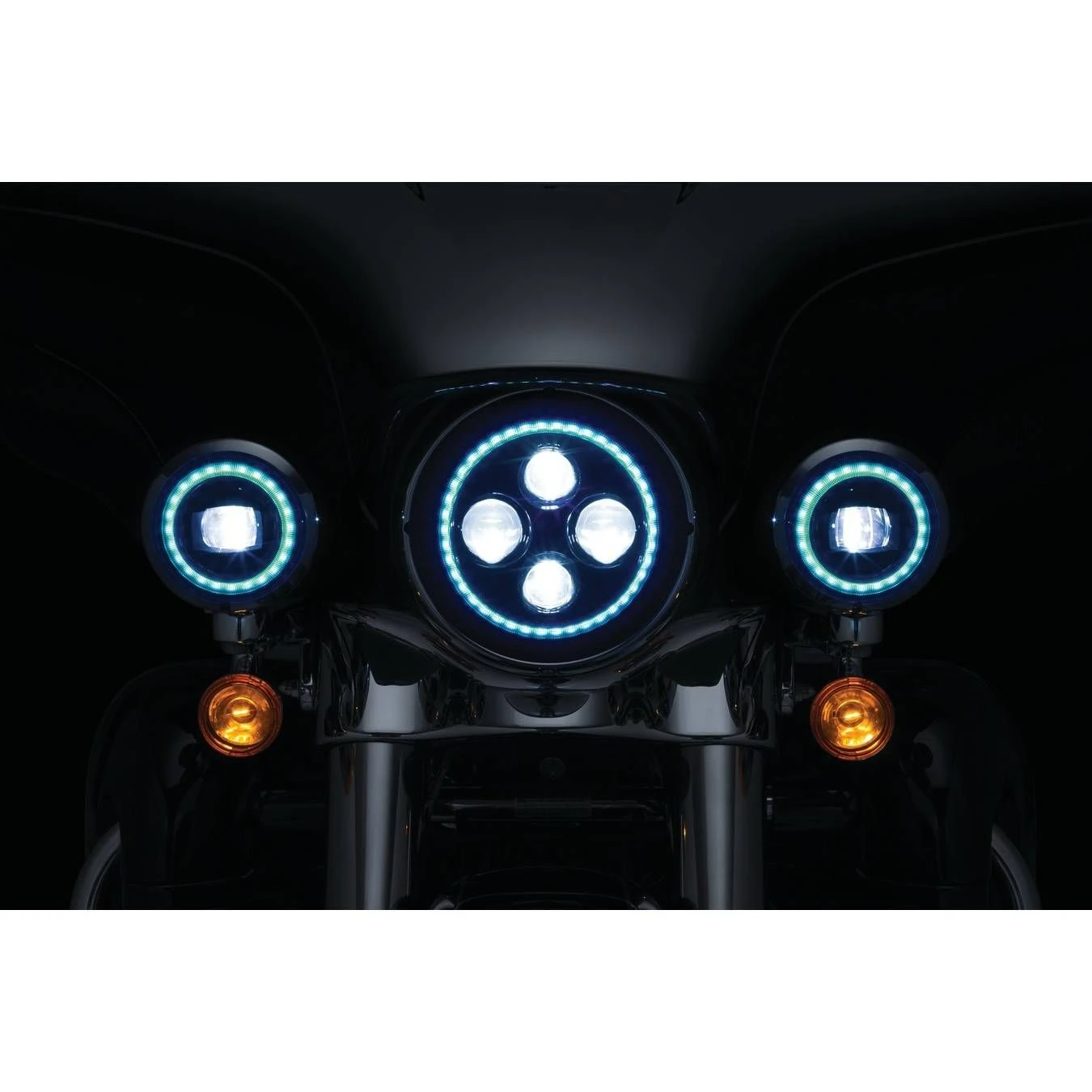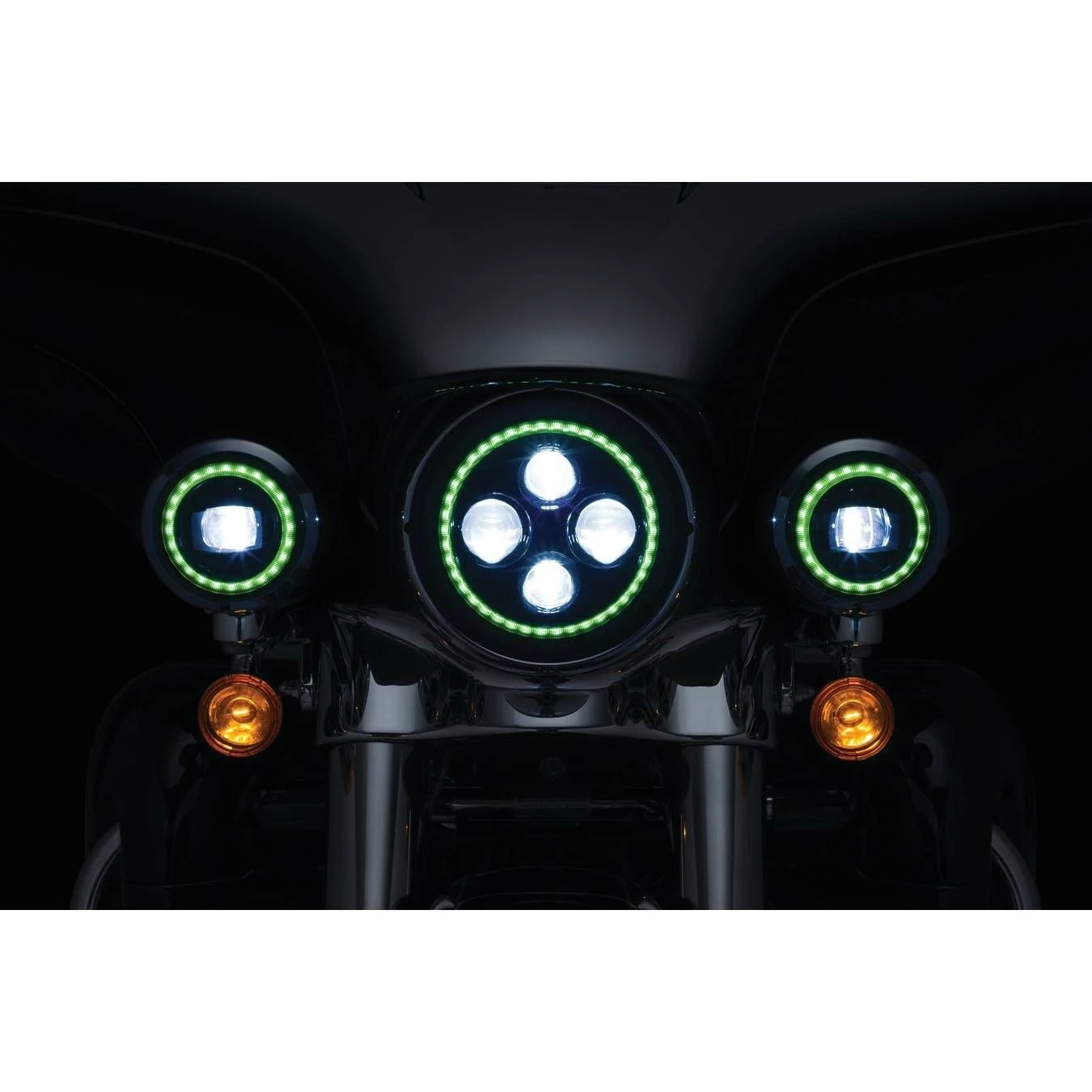 The perfect high-powered complement to Kuryakyn’s top-selling Orbit Prism 7″ L.E.D. Headlamp. Bluetooth controlled via downloadable iOS or Android app to customize outer halo ring with infinite color options. Powerful high-output L.E.D.’s significantly enhance the rider’s nighttime field of vision and all-around visibility.