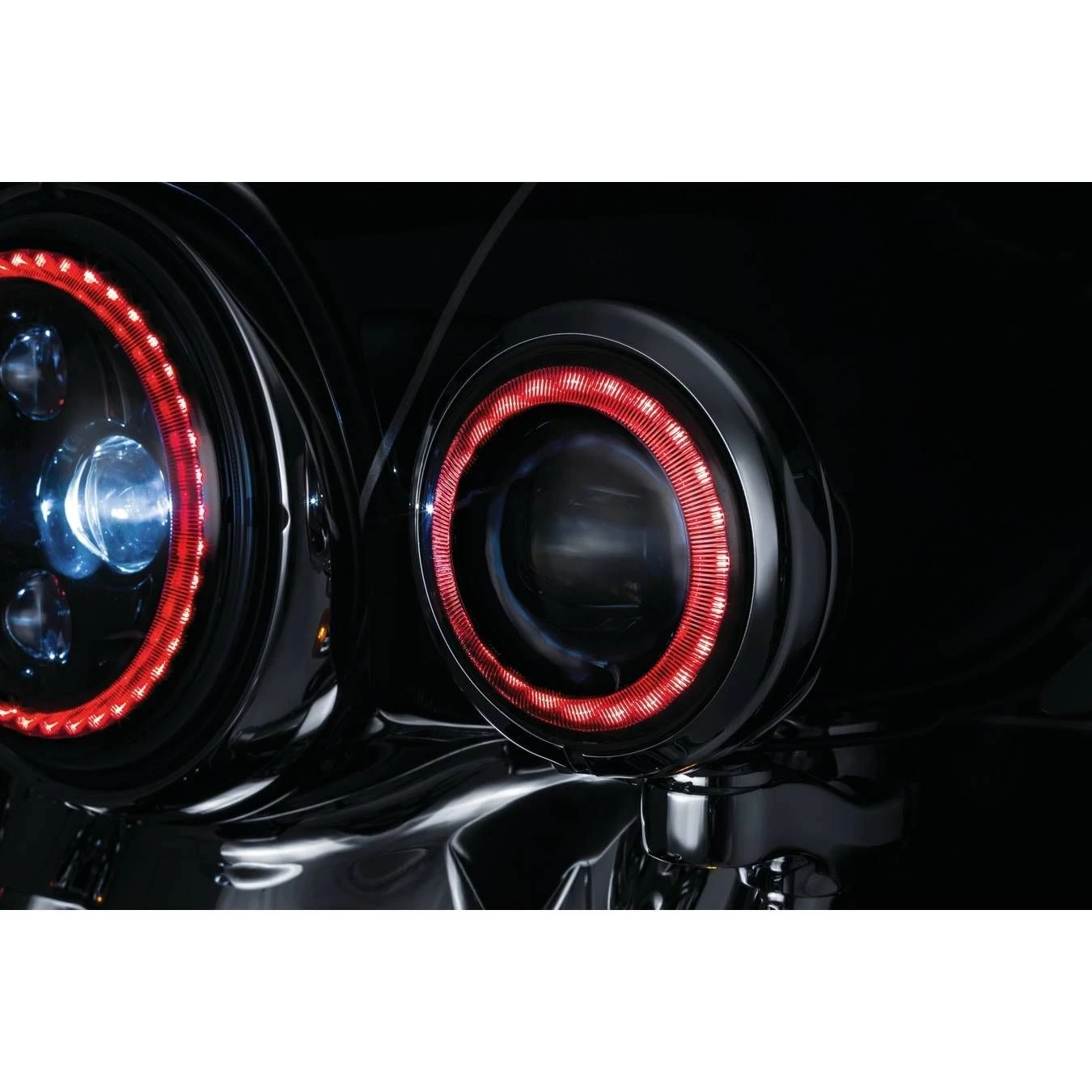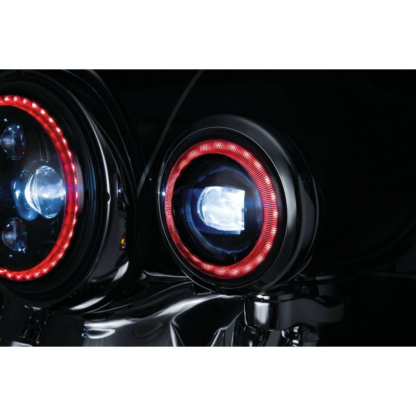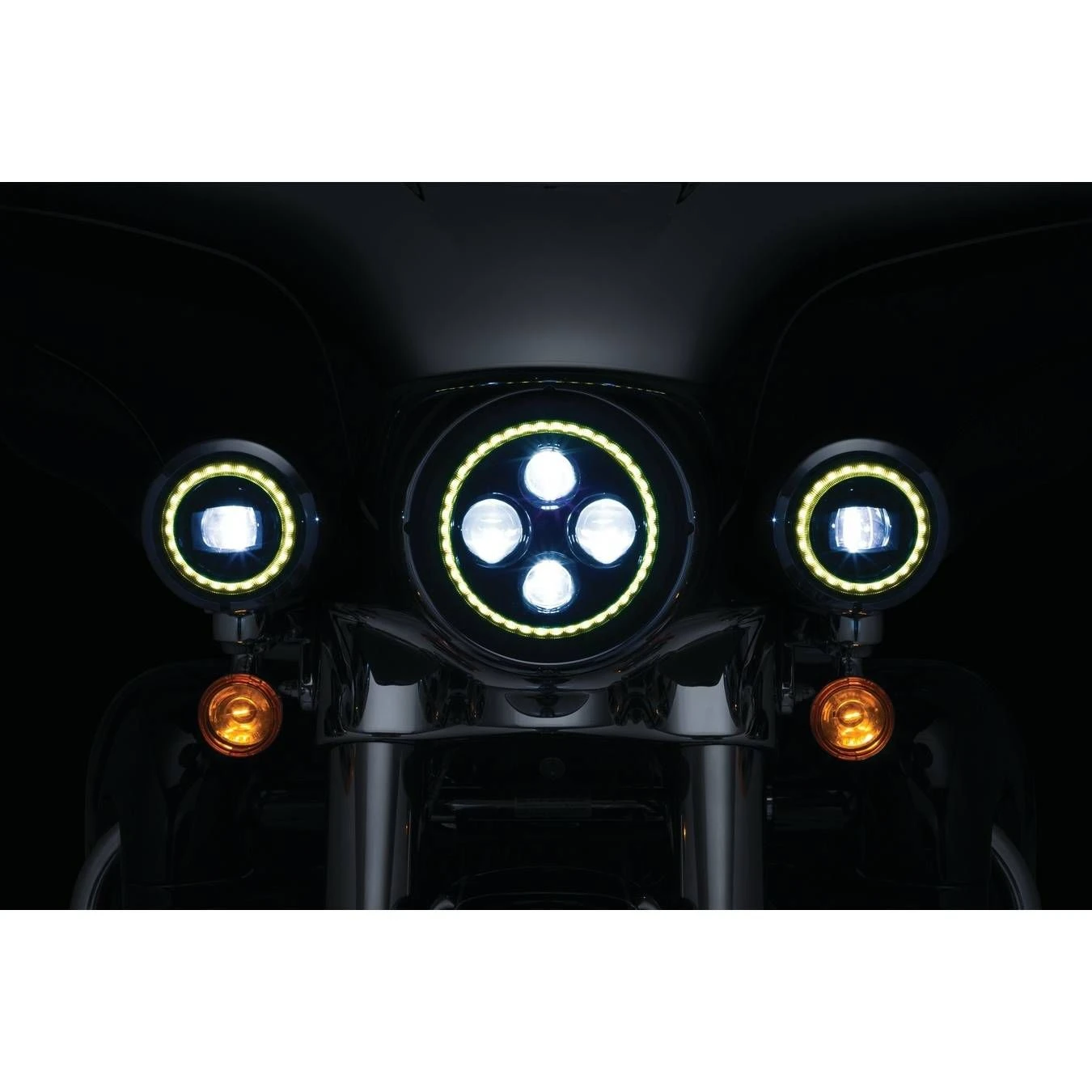The perfect high-powered complement to Kuryakyn’s top-selling Orbit Prism 7″ L.E.D. Headlamp. Bluetooth controlled via downloadable iOS or Android app to customize outer halo ring with infinite color options. Powerful high-output L.E.D.’s significantly enhance the rider’s nighttime field of vision and all-around visibility.