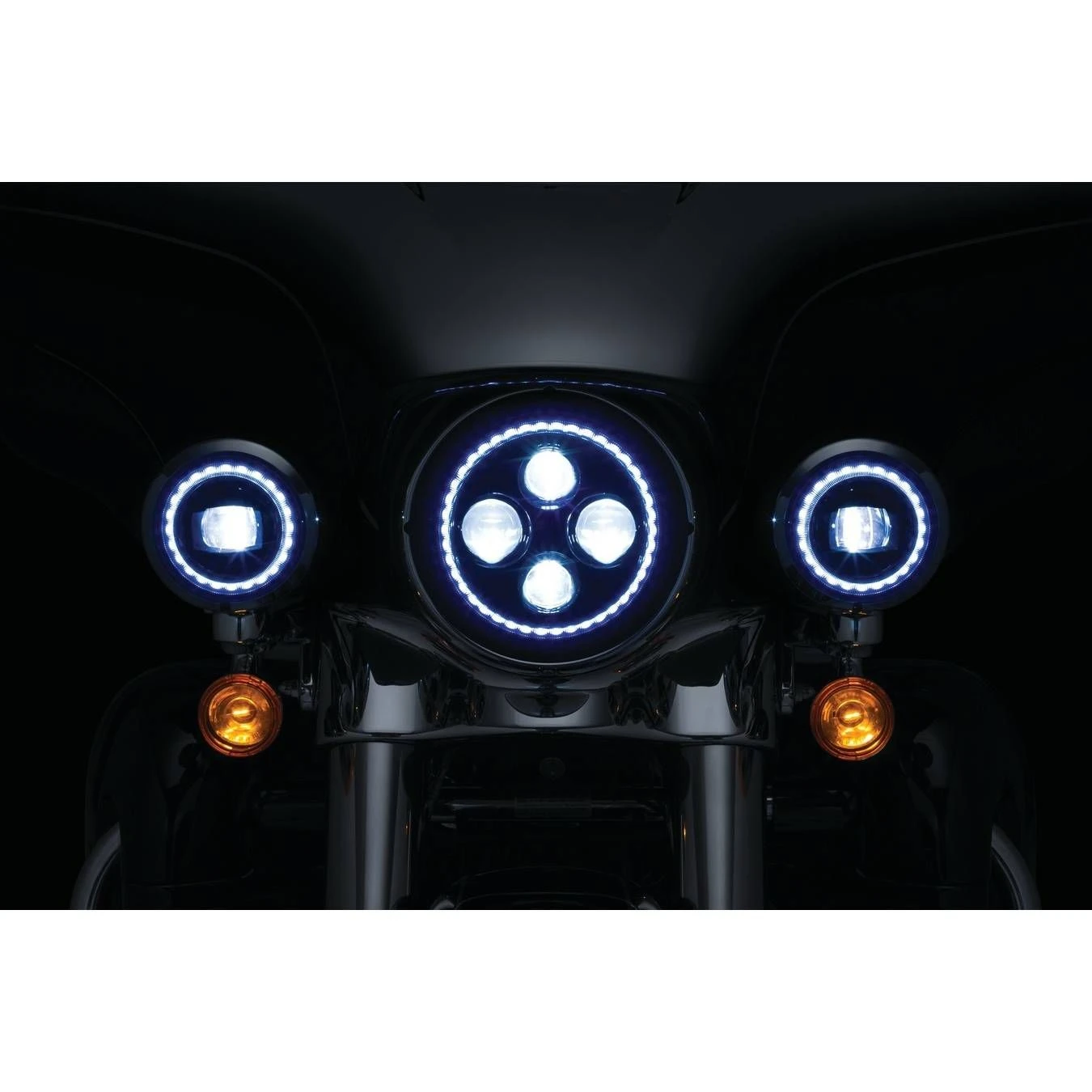 Styled to match Kuryakyn’s top-selling Orbit Vision Headlamp, powerful high-output L.E.D.’s with integrated white halo ring significantly enhance the rider’s nighttime field of vision and all-around visibility.
