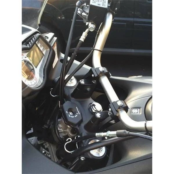 - Risers are held by the original clamps and re-clamp the handlebars with pivoting fore and aft adjustment