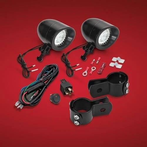 Simple and smart usually wins the bet and that is exactly what Big Bike Parts® gives with their three piece 1 ¼” Highway Bar Clamp Light kit in black satin finish. These clamps easily mount to 1 ¼” bars and have a 3/8″ mount hole to allowmounting of lights where needed. Big Bike Parts® includes a pair of their 2 3/8″ black satin LED spot lights which feature a color temperature of 4000k, and shine at a bright 400 lumens. The light kits come with all necessary wiring to add a pairof lights to your highway bars and increase your safety. These small but effective lights have a built in visor in the bezel.