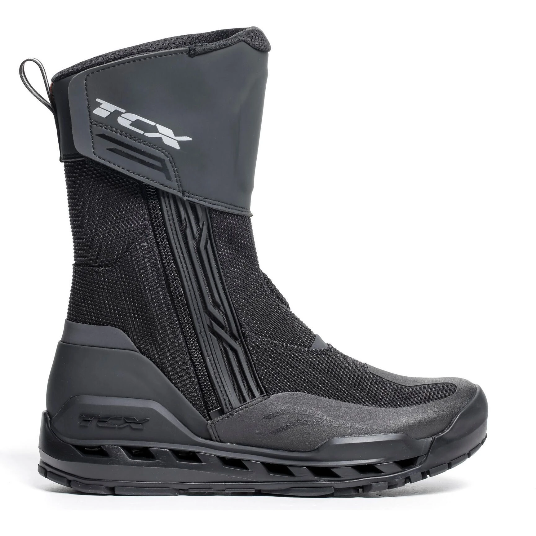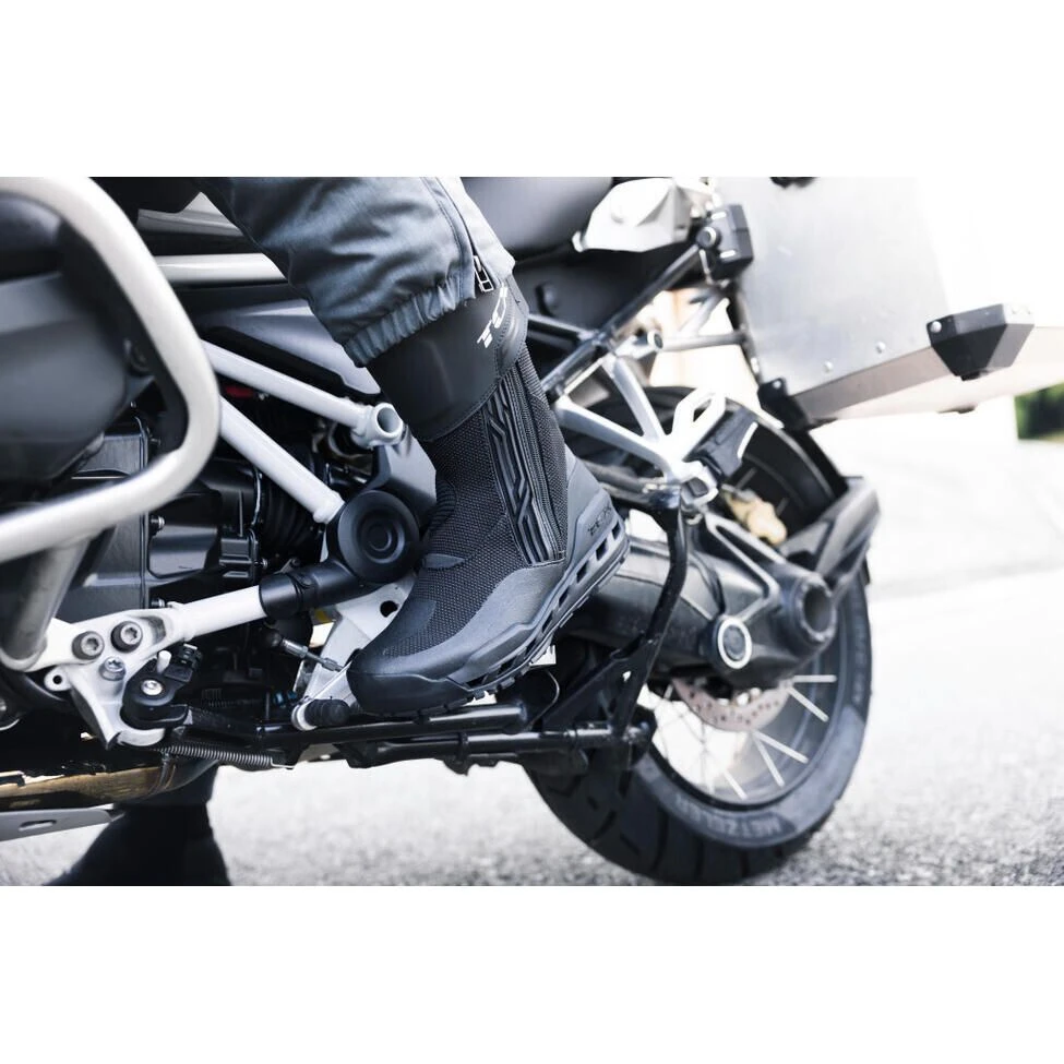 The Clima 2 Gore-Tex Surround® touring boots are protective, waterproof and suitable for all weather conditions. Boasting the perfect balance between fabric and reinforced areas, these boots are both lightweight and comfortable while guaranteeing maximum safety in those areas most exposed to impact and abrasion. Their Gore-Tex Surround® technology, with internal ventilation grille and side vent perforation, channels moisture and heat outward. The exclusive sole construction operates in synergy with the breathable and wear-resistant upper and with the Gore-Tex® Extended Comfort membrane, to ensure all-round comfort in every climate. The reinforced polyurethane inserts on shin and ankle, as well as the polyurethane lever guard, ensure maximum safety. The Groundtrax® sole features a rubber tread with an anti-slip design for maximum grip on all surfaces and is accompanied by a polyurethane midsole providing structural rigidity, comfort and long-lasting cushioning.