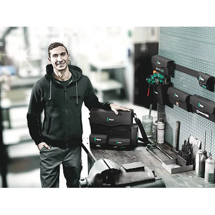 The Wera 2go tool container is the ideal solution for individual and convenient tool transport thanks to its hook and loop fastener system and its compactness. The inner and outer hook and loop fastener zones ensure a maximum in terms of space utilisation. This means that an incredible number of tools can fit in and on the container. Wera 2go 2 ensures a low weight since only the tools really needed for the job are taken along. The robust and dimensionally stable material protects the tools carried against damage and moisture and enhances the service life of the tool container. The padded and width-adjustable shoulder strap and the snug fit of the container on the body mean that the container is easy and convenient to carry. The hands remain free during transport. It comes with a quiver with an individually adjustable hook and loop fastener partition for screwdrivers and other tools.